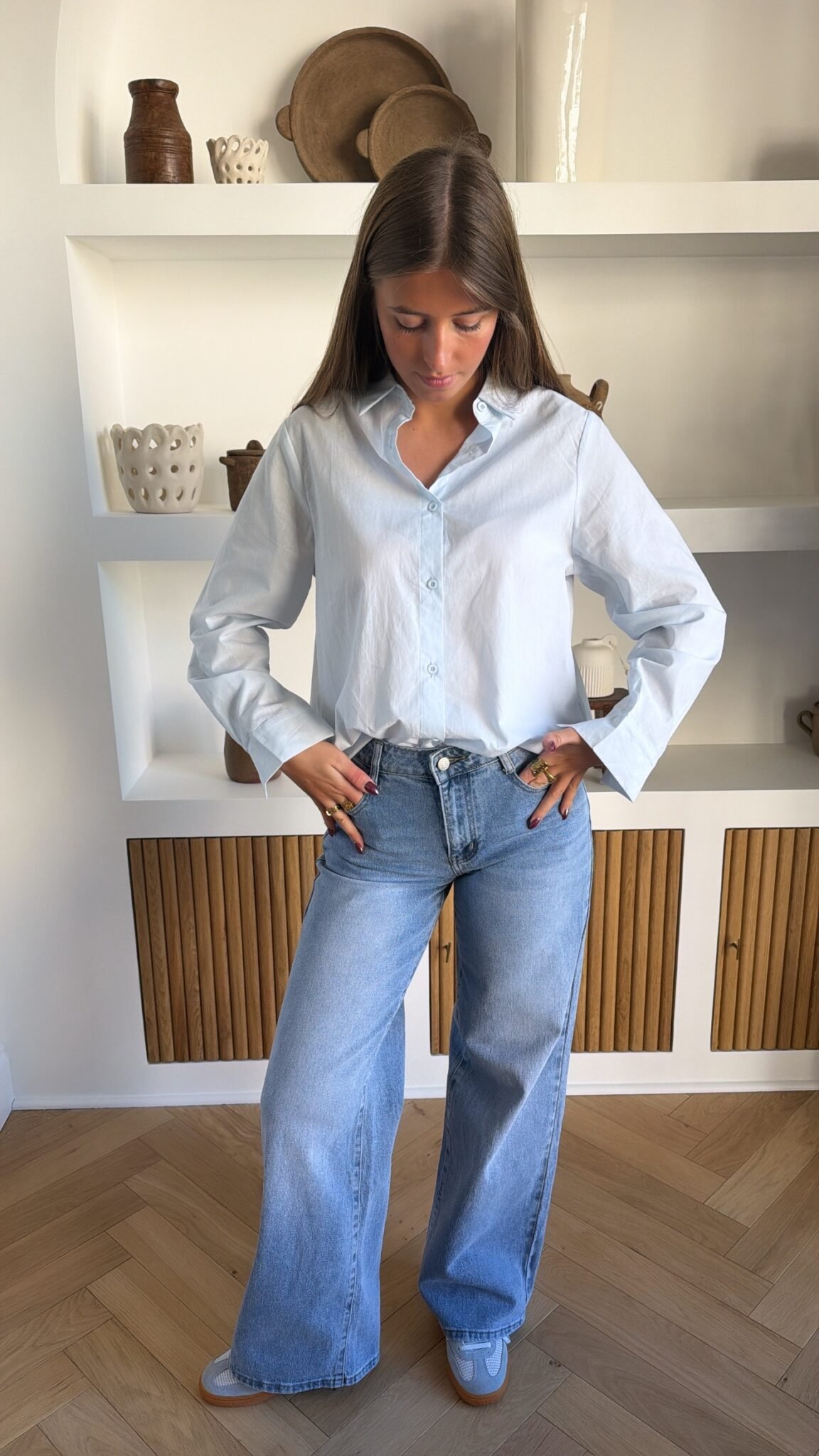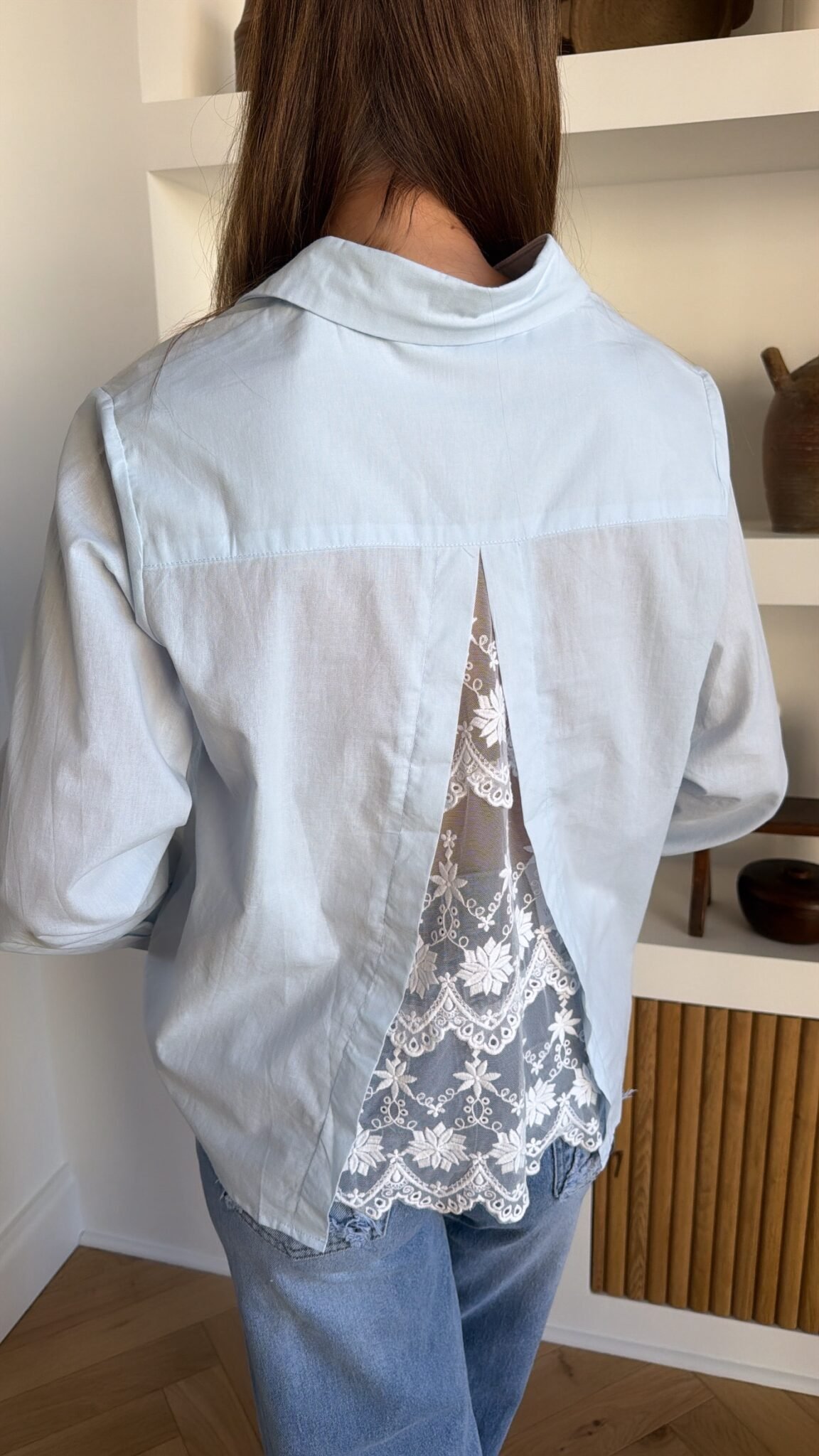 – Chemise bleu ciel, dos en dentelle