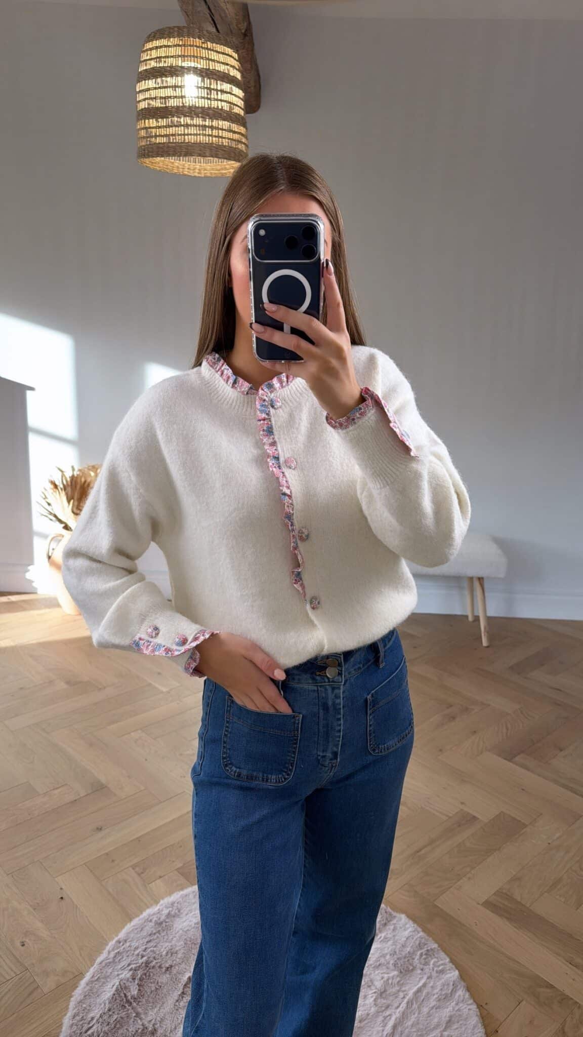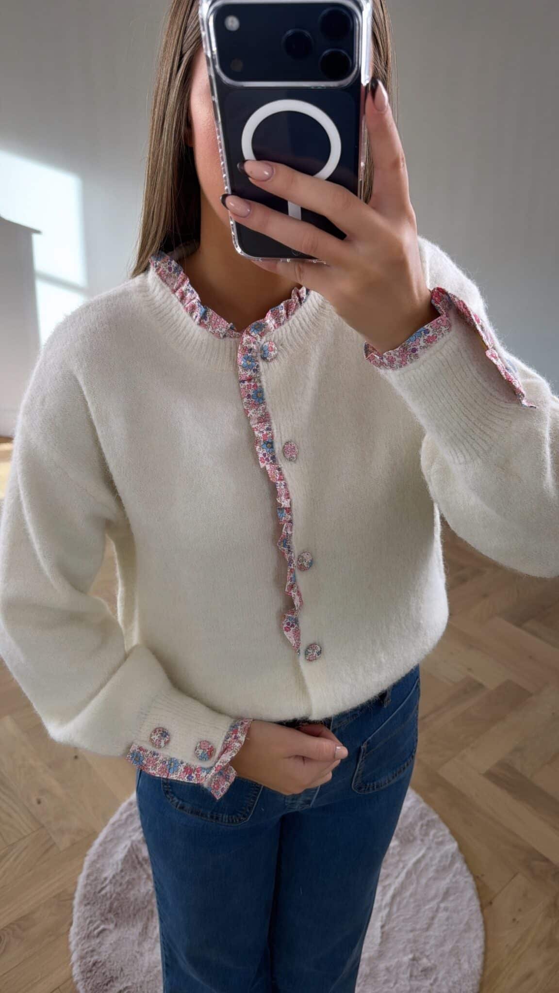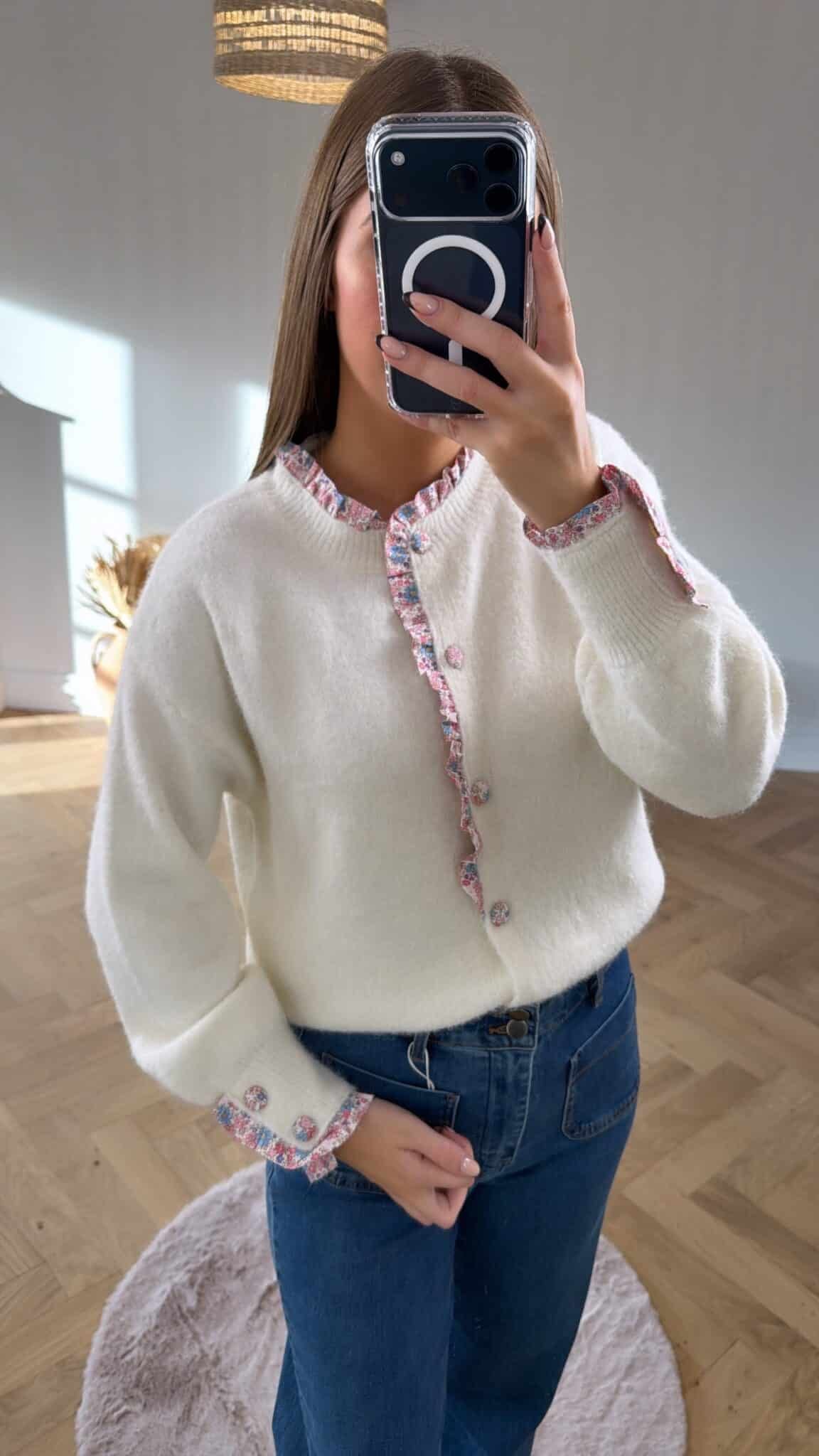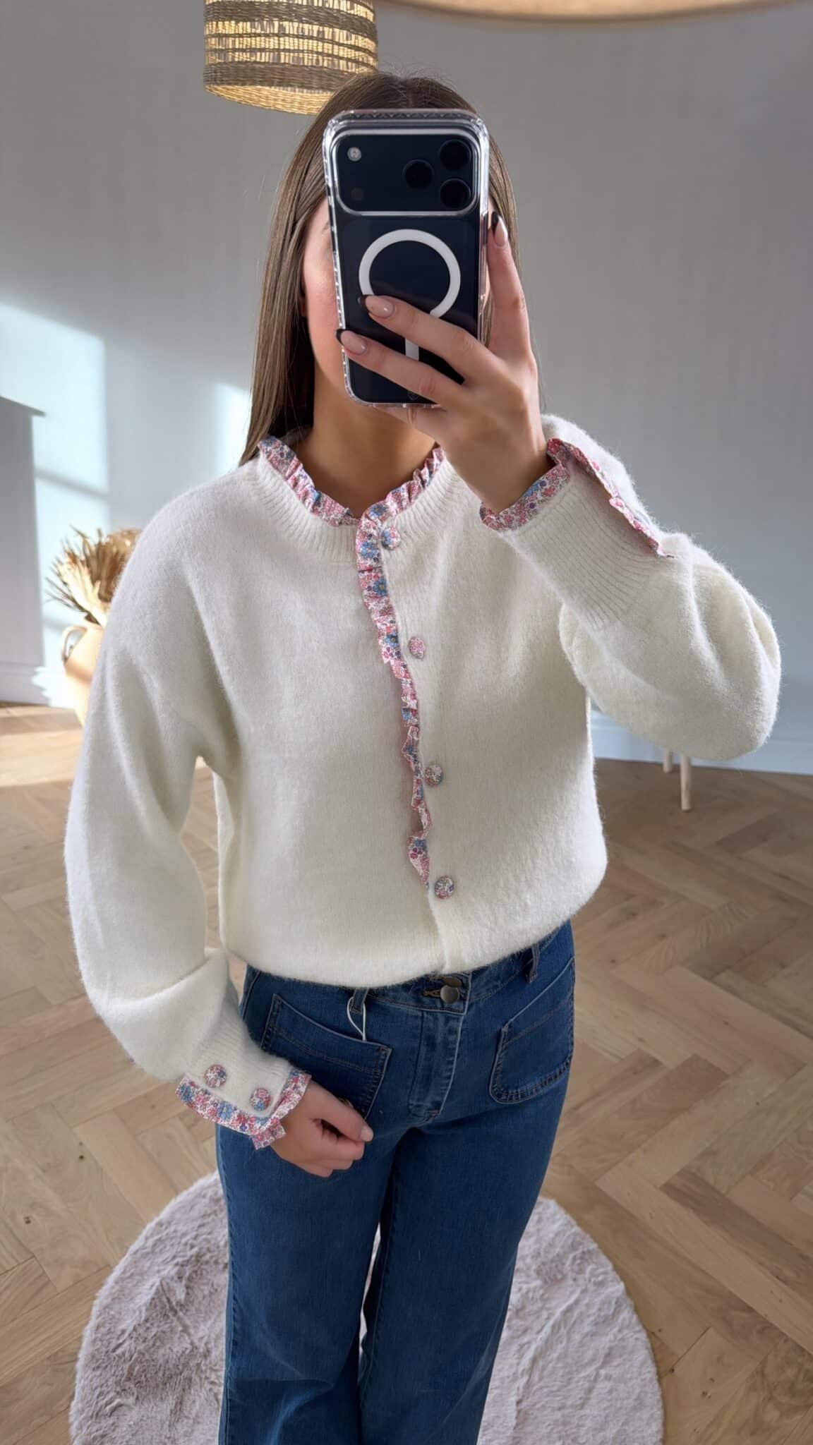 – Gilet blanc avec boutons fleurs rose