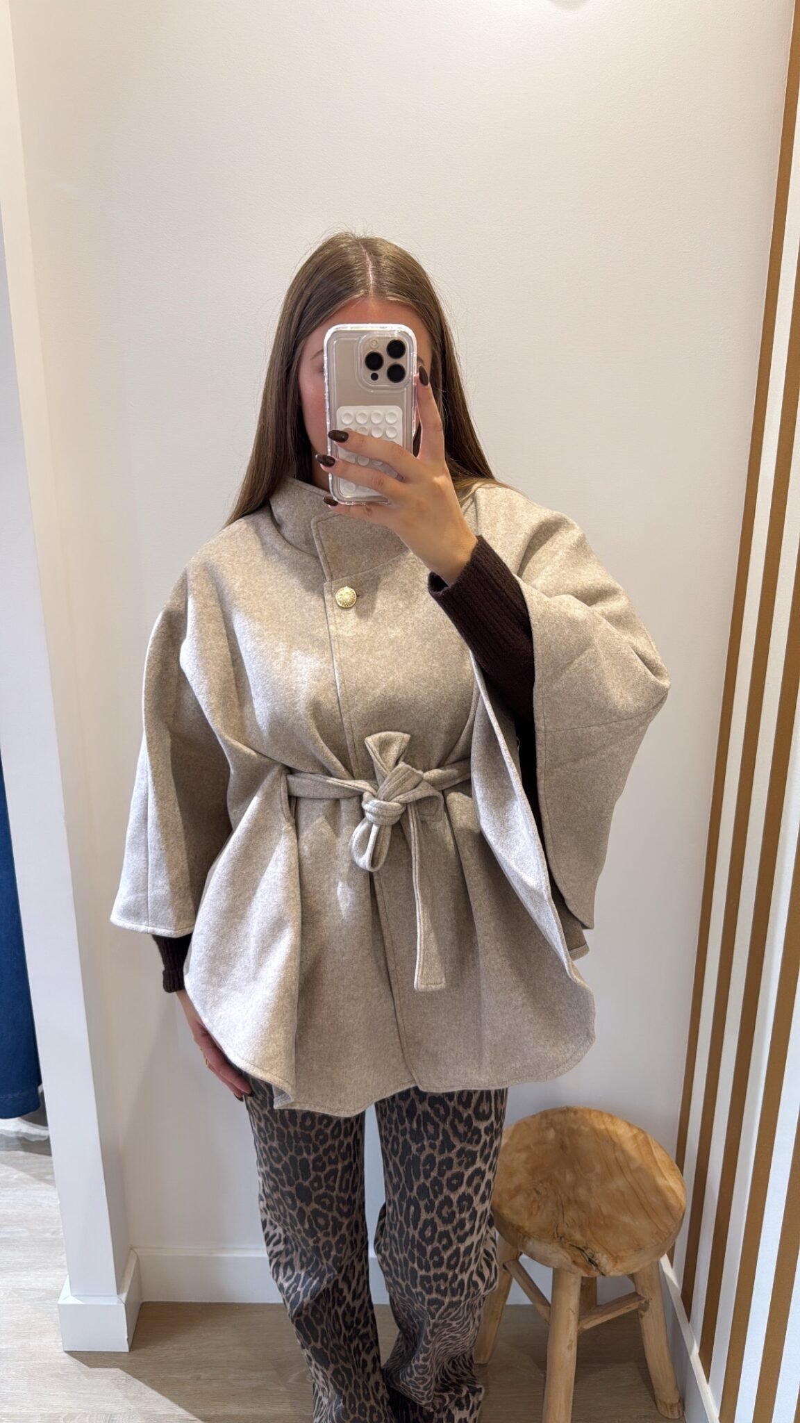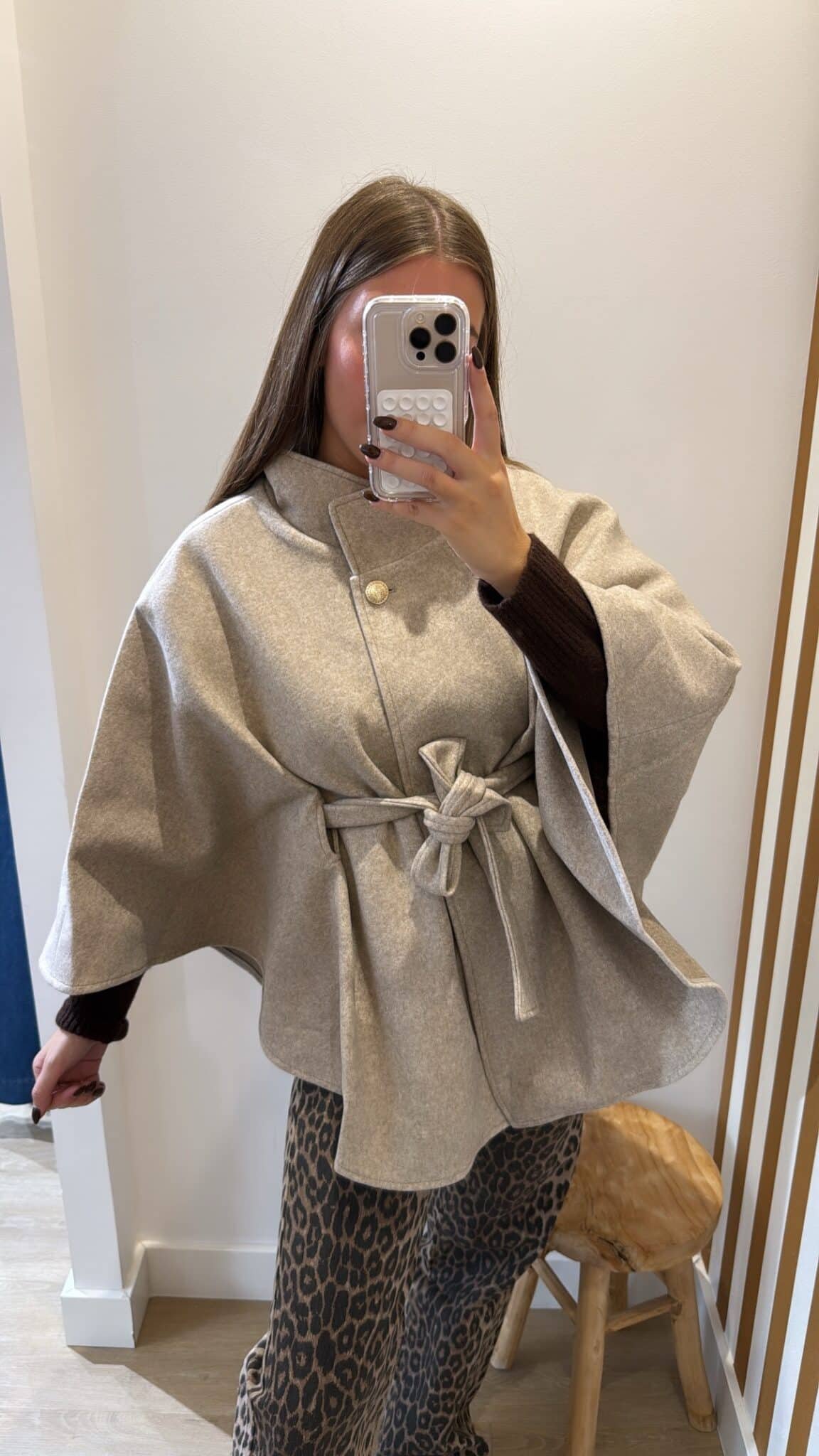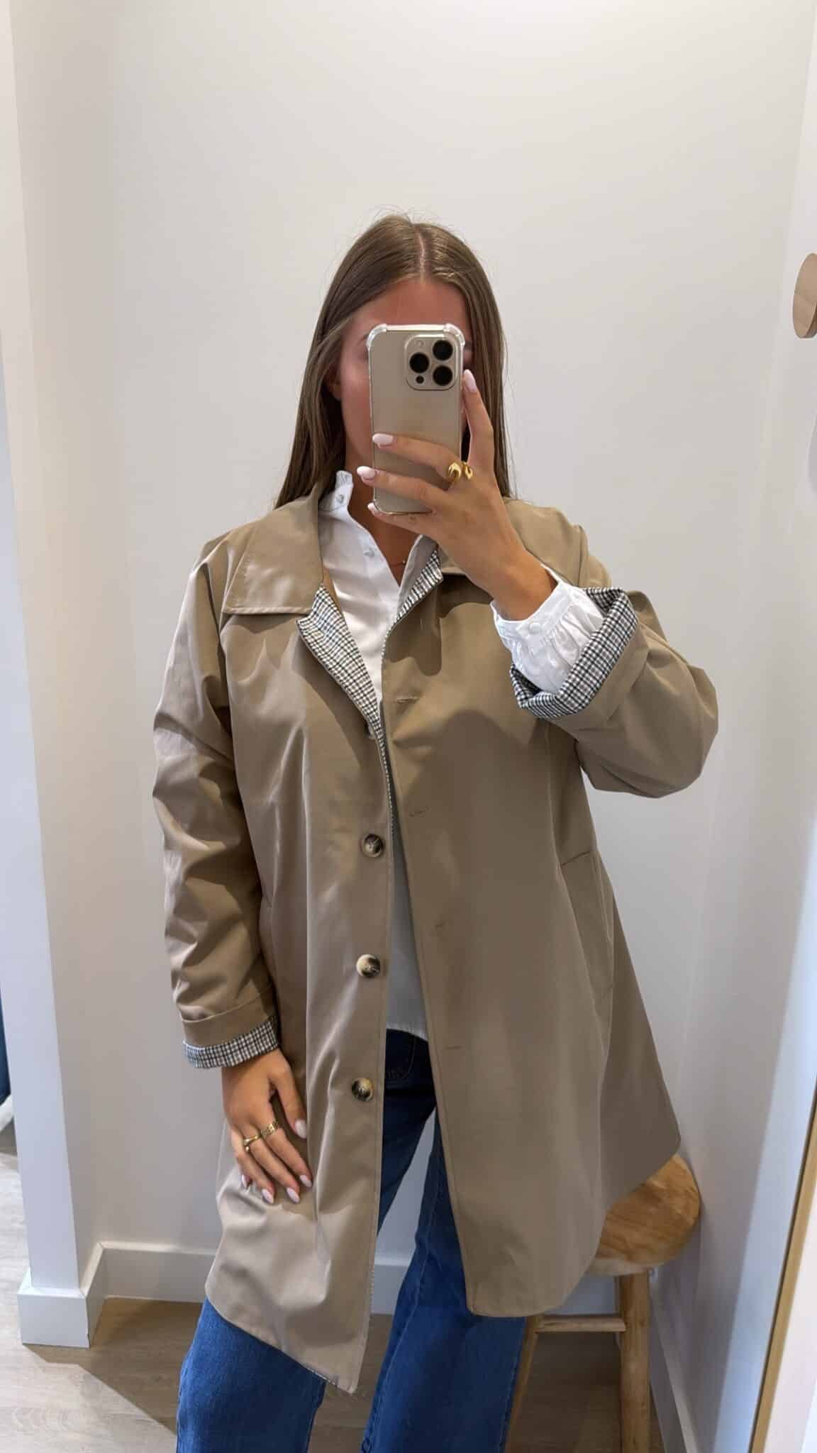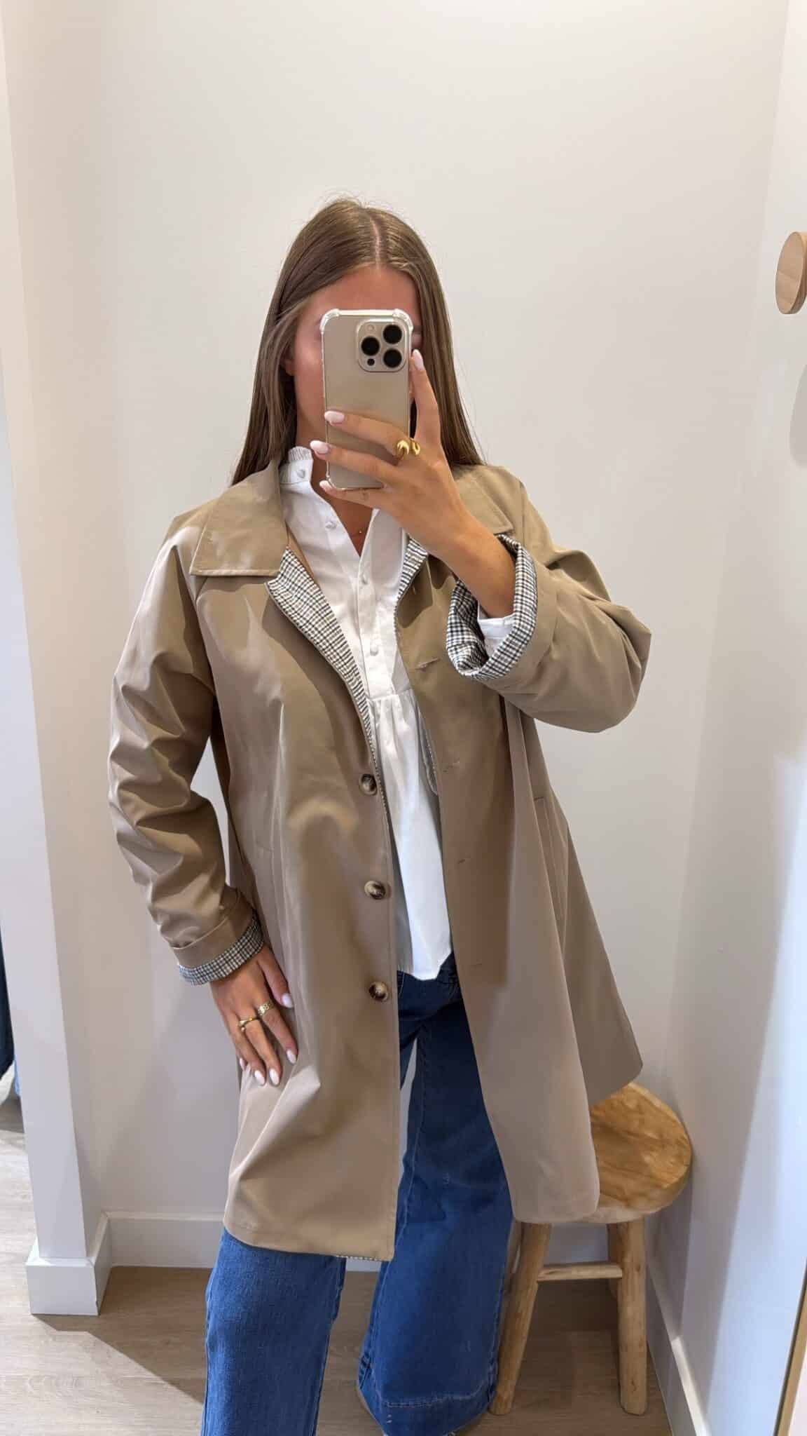 Manteau en tissu déperlant beige, conçu pour résister au froid et à l’humidité. L’intérieur doublé pour un confort optimal.