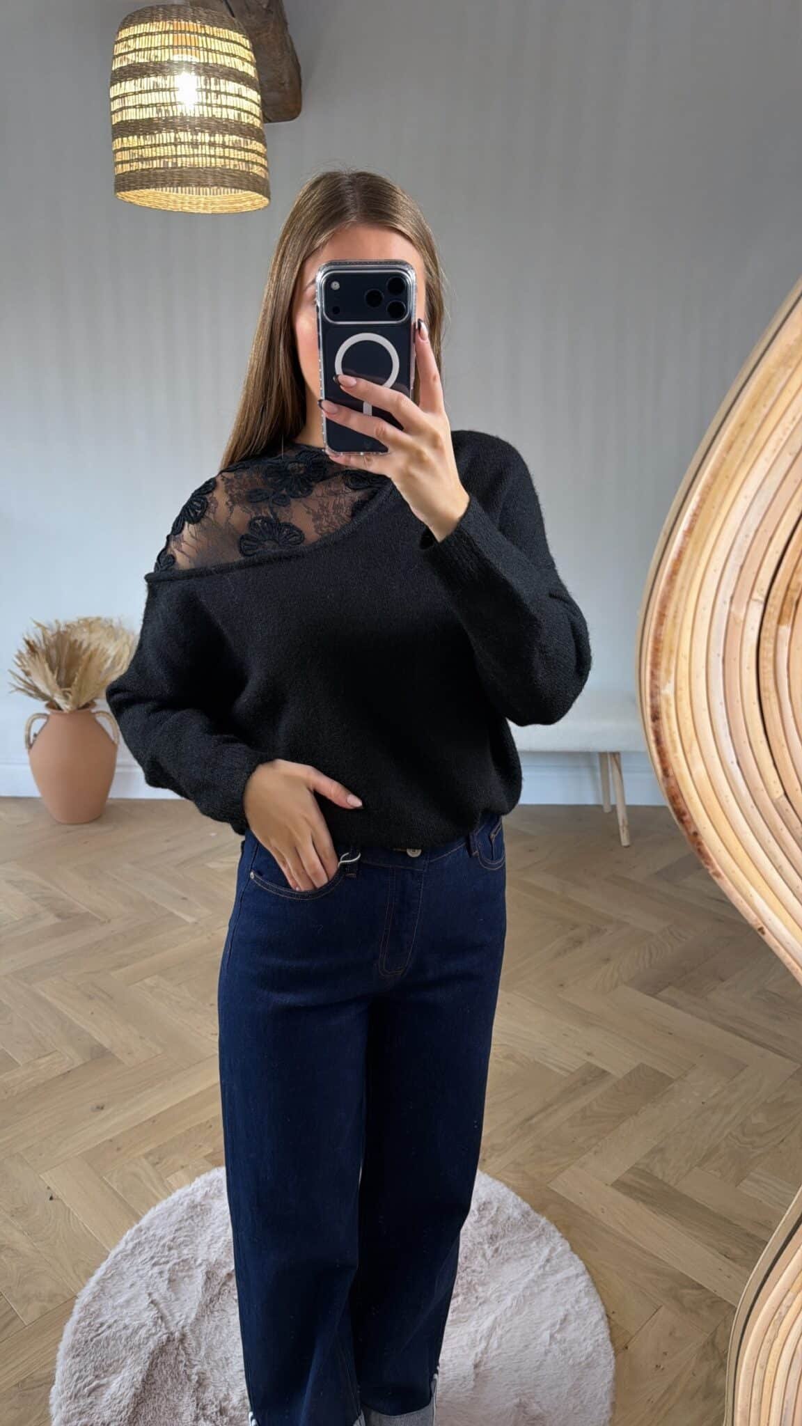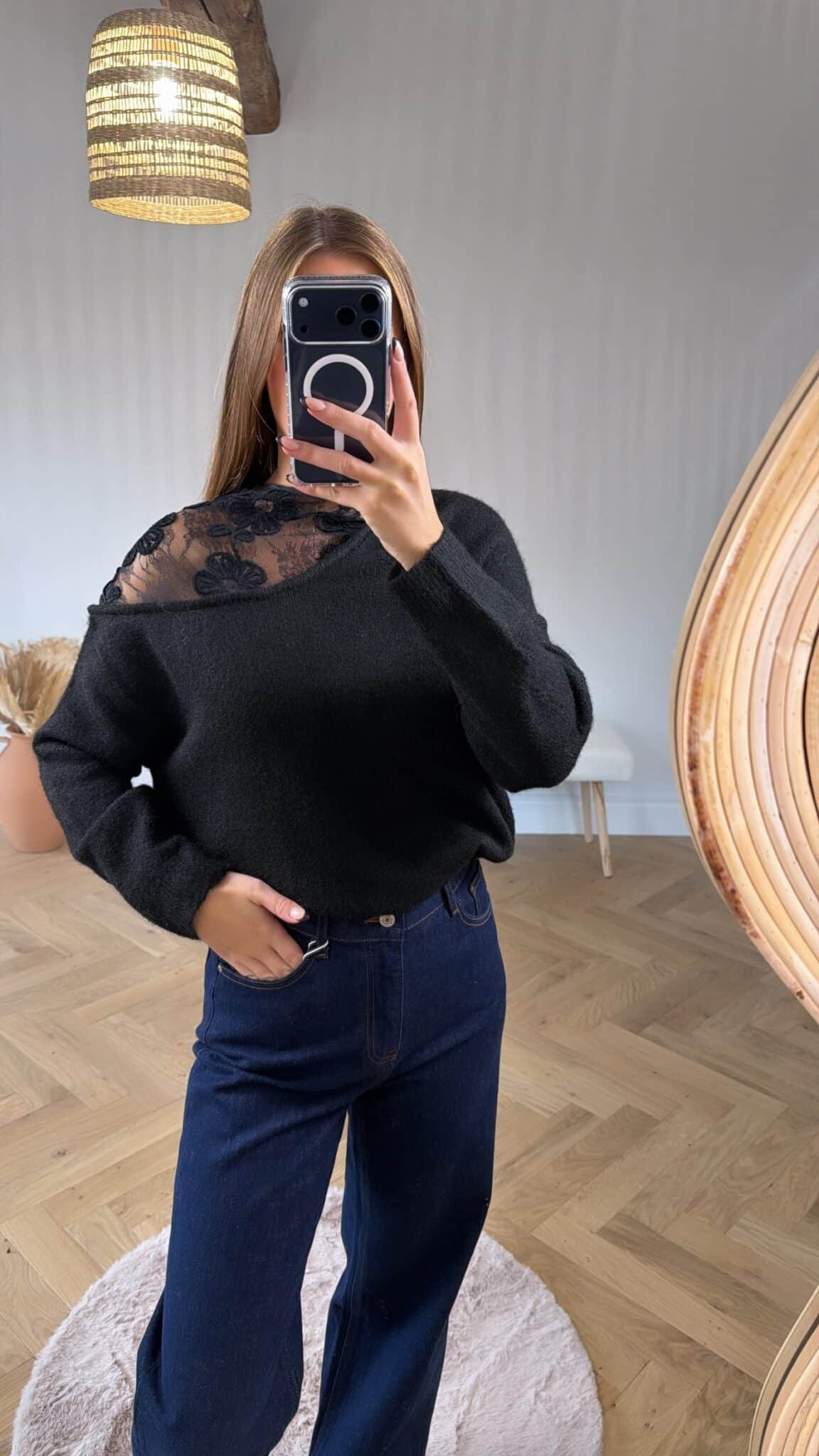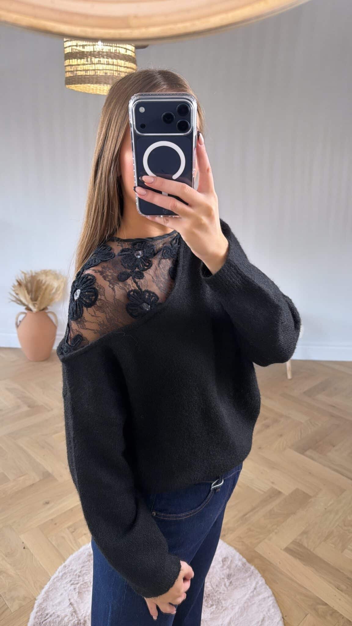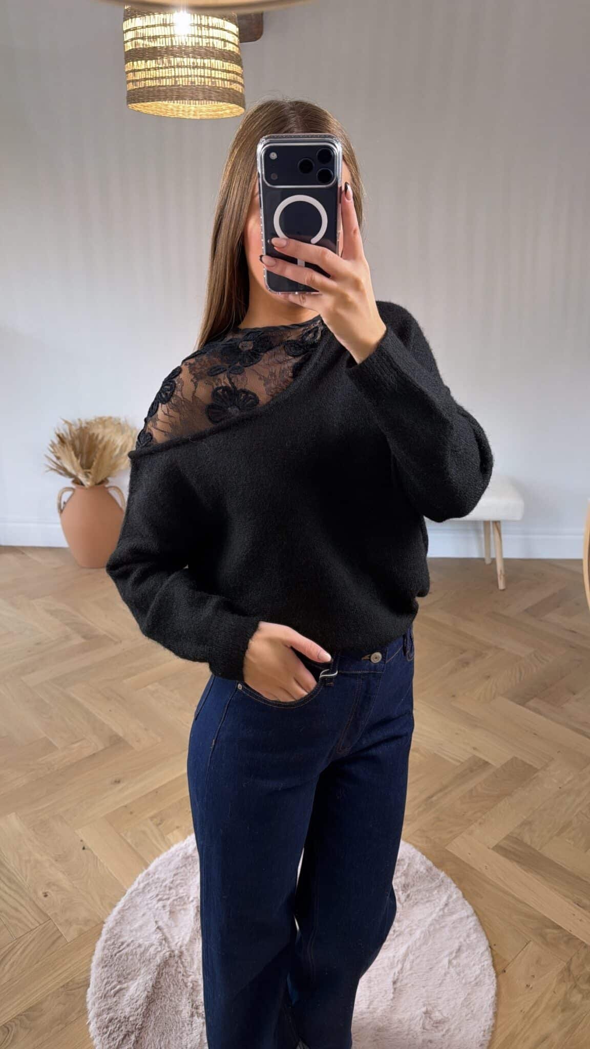 – Pull noir avec détails à l’épaule en dentelle