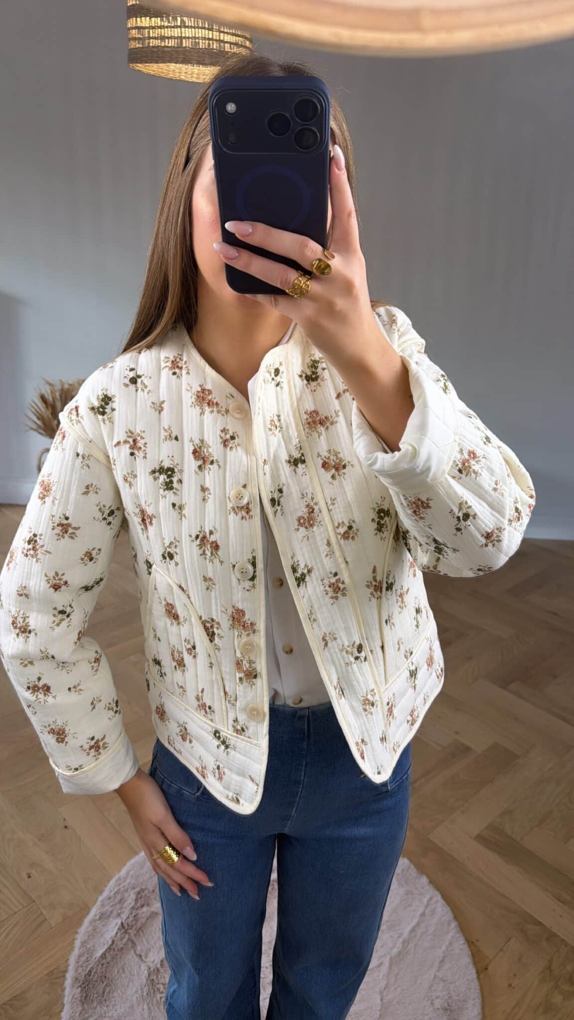 – Veste, matelassée, écru avec fleurs